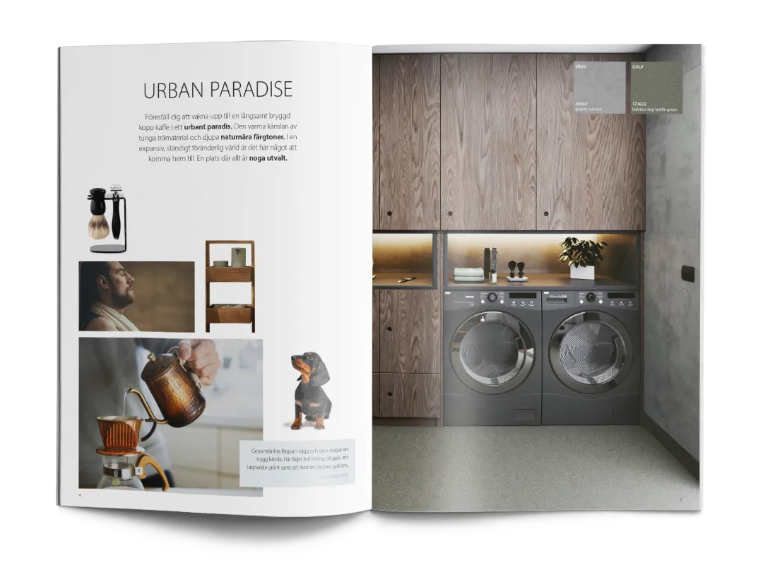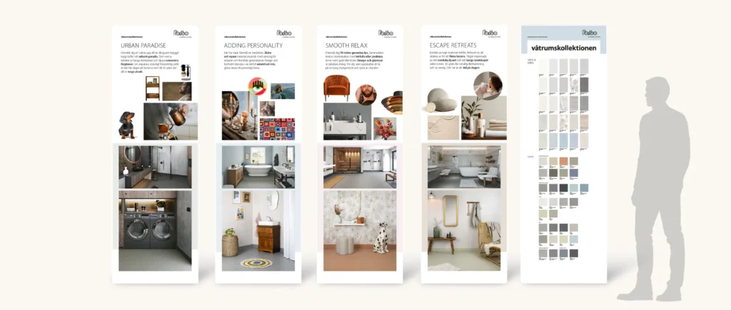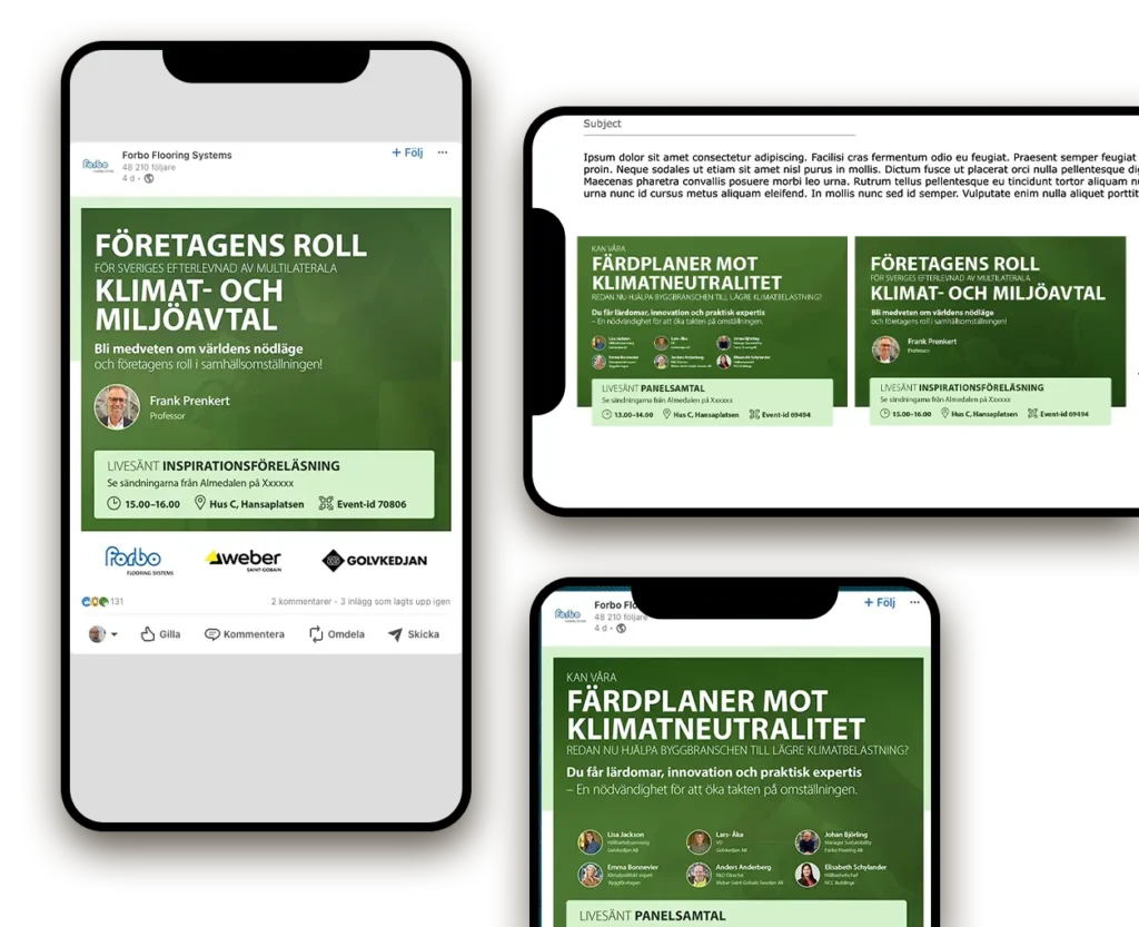 Forbo Flooring stöttar vi med grafisk produktion. Ibland mindre snabba produktioner som till exempel banners, säljblad och powerpointpresentationer. Men även större uppdrag som design och produktion av produktkatalog och digital marknadsföring inför event.