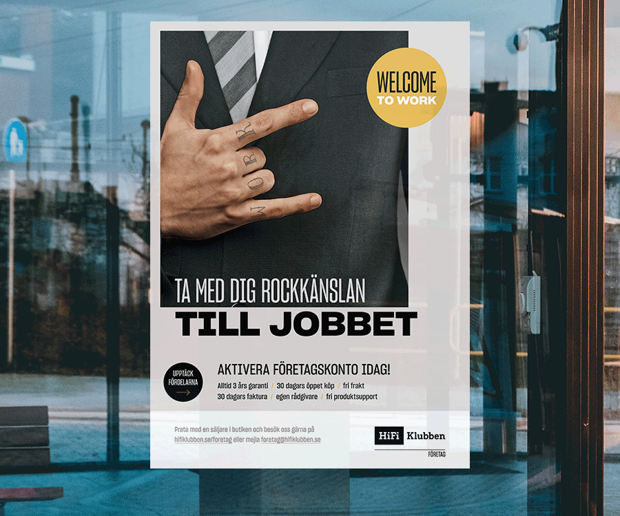 HiFi-klubben ville få fler att uppmärksamma deras försäljning mot företag. Vi skapade en kampanj med filmer för sociala medier, posters, stickers, mobiler och skyltning.
